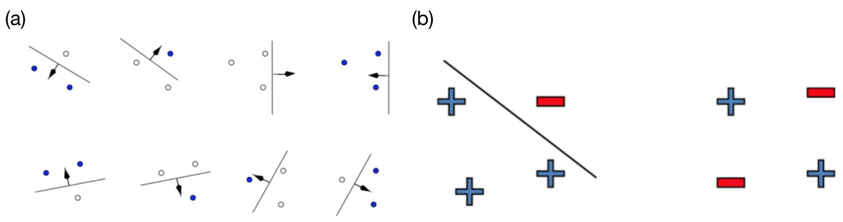 Now, let’s move to the situation of infinite hypothesis class. Clearly, we don’t have a measurement for the size of the hypothesis class any more, but it is still possible to quantitatively measure complexity of the model. For learnability in classification problems, what really matters is not the literal size of the hypothesis class, but the maximum number of data points that can be classified exactly. Take the simple situation in Figure 1 for example, the hypothesis class of 1-dimensional linear classifier has an infinite size, but this doesn’t mean this class is a very complex class. As shown in Figure 1 (a), two points with whatever labels can be classified correctly by a linear classifier, but in Figure 1 (b), we can see that this no longer holds for 3 points, as the last example in (b) cannot be classified correctly by any hypothesis in the linear classifier class. This inspires us that in order to measure the richness of our hypothesis class, we can try to construct a subset $C$ of the data domain for which our classifier fails or succeeds. To understand the power of our hypothesis class, we just focus on its behavior on $C$ and try to check how many different possible classification decisions on $C$ can our hypothesis class capture. Then, if the hypothesis class can explain all decisions possible on $C$, then one can construct a ’misleading data distribution’ so that we maintain realizability on $C$ but can be totally wrong on the part outside of $C$ and thus suffer large risk. This implies that to achieve learnability, we need to restrict the size of $C$.